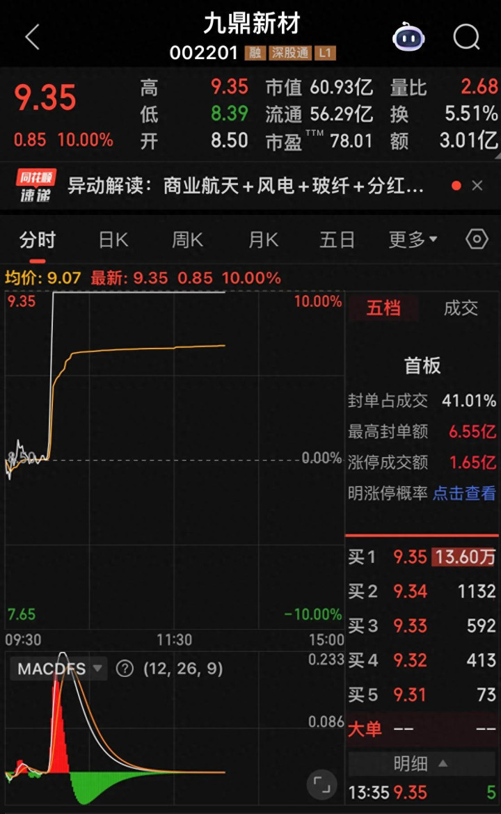 九鼎新材的走势堪称惊艳。早盘还在平盘附近震荡,10点一过,突然被天量买盘直线拉起,短短五分钟就死死封住涨停板。宏和科技也不甘示弱,紧跟步伐涨停。中材科技、中国巨石这些行业巨头同样涨势喜人,整个板块热气腾腾。